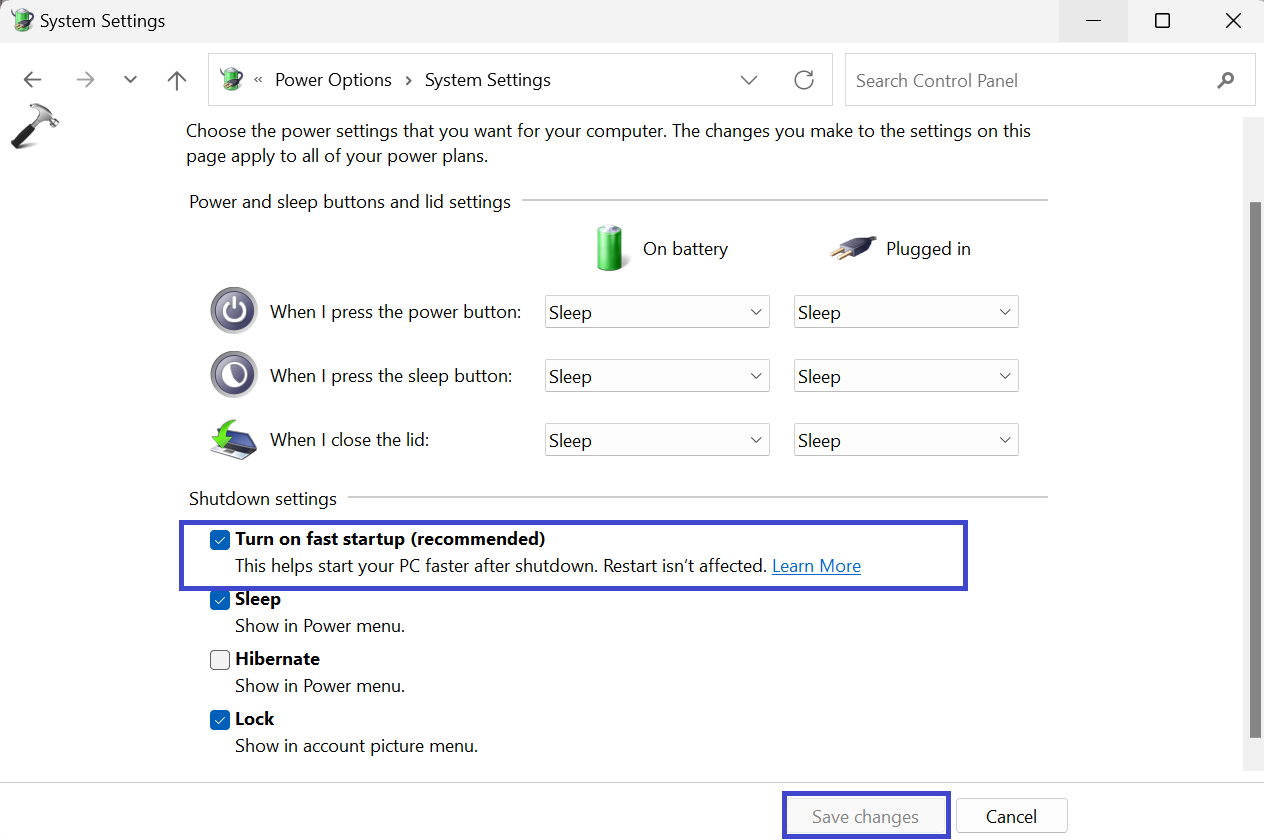 4. Dans la section Paramètres d'arrêt, décochez la case "Activer le démarrage rapide (recommandé)" boîte.