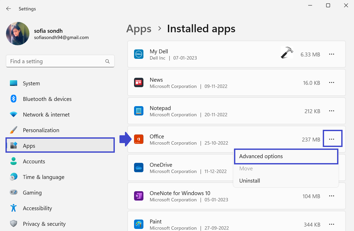 3. Cliquez sur les trois points et sélectionnez « Options avancées ».