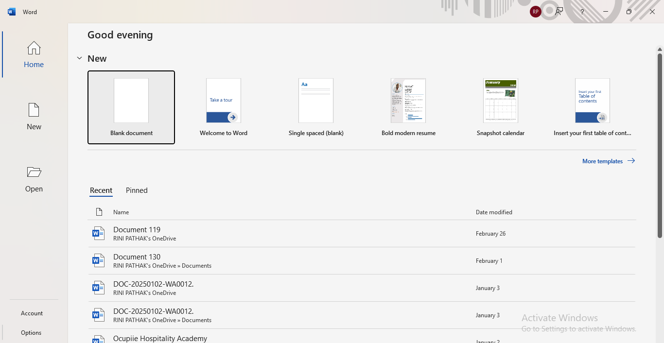 Étape 1-Accédez principalement à n’importe quelle application Office, puis à Comptes.