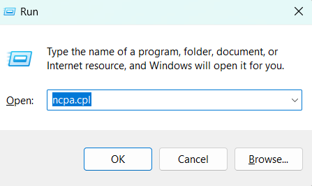 1. Ouvrez l'invite d'exécution en appuyant sur les touches Windows + R. Tapez « ncpa.cpl » et appuyez sur Entrée.