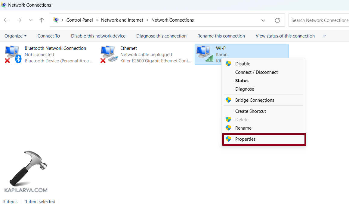 2. Faites un clic droit sur le réseau que vous utilisez actuellement et choisissez « Propriétés ».