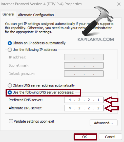 5. Cochez l'option « Utiliser les adresses de serveur DNS suivantes“.
