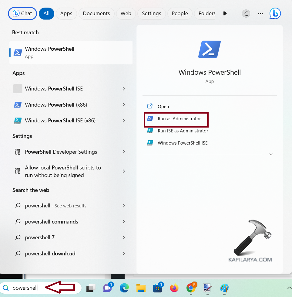 1. Tapez « Powershell » dans la barre de recherche et ouvrez « Windows PowerShell » en cliquant sur « Exécuter en tant qu'administrateur ».