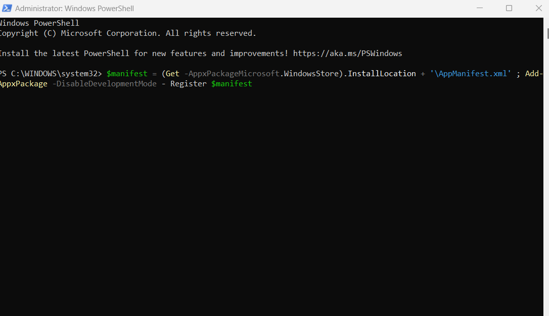 $manifest = (Get-AppxPackage Microsoft.WindowsStore).InstallLocation + 'AppxManifest.xml' ; Add-AppxPackage -DisableDevelopmentMode -Register $manifest