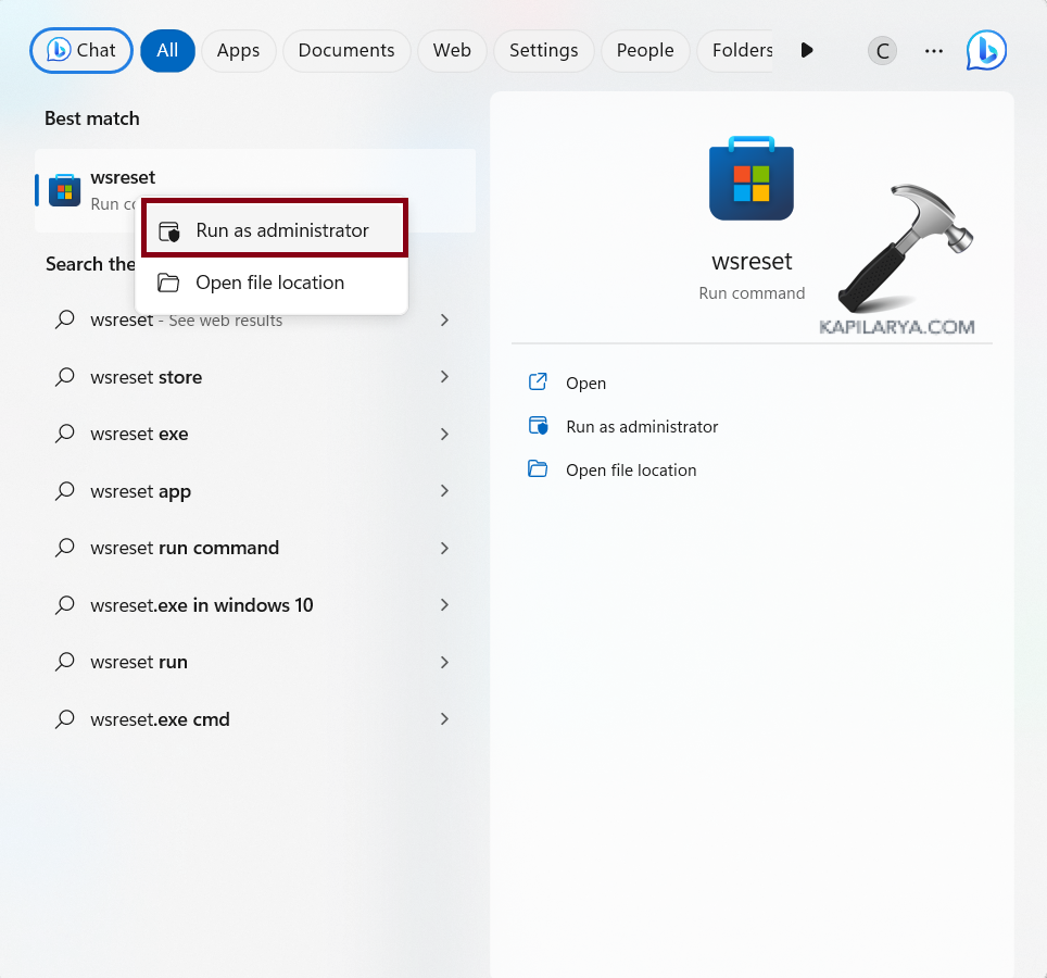 2. Faites un clic droit sur wsreset et choisissez « Exécuter en tant qu'administrateur ».