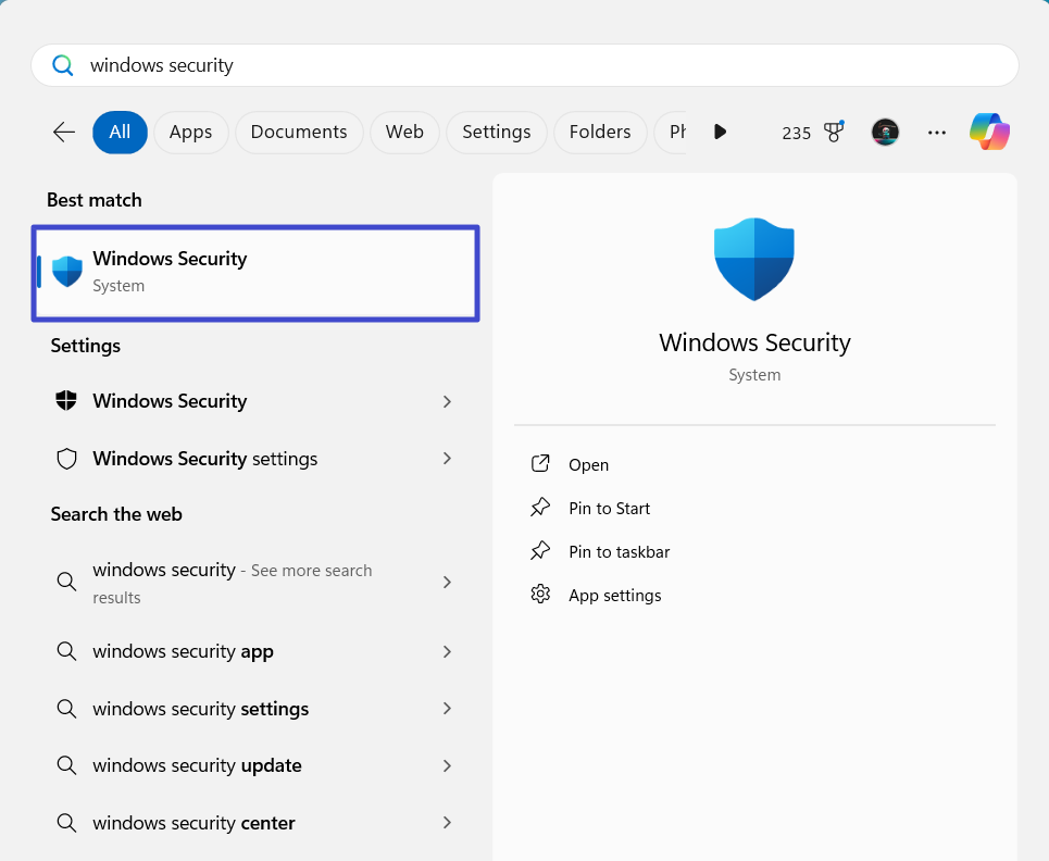 1. Tapez «Sécurité Windows» dans la recherche Windows.