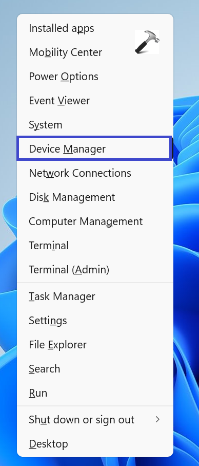 1. Appuyez sur la touche Windows + X pour ouvrir le menu WinX. Sélectionnez Gestionnaire de périphériques.