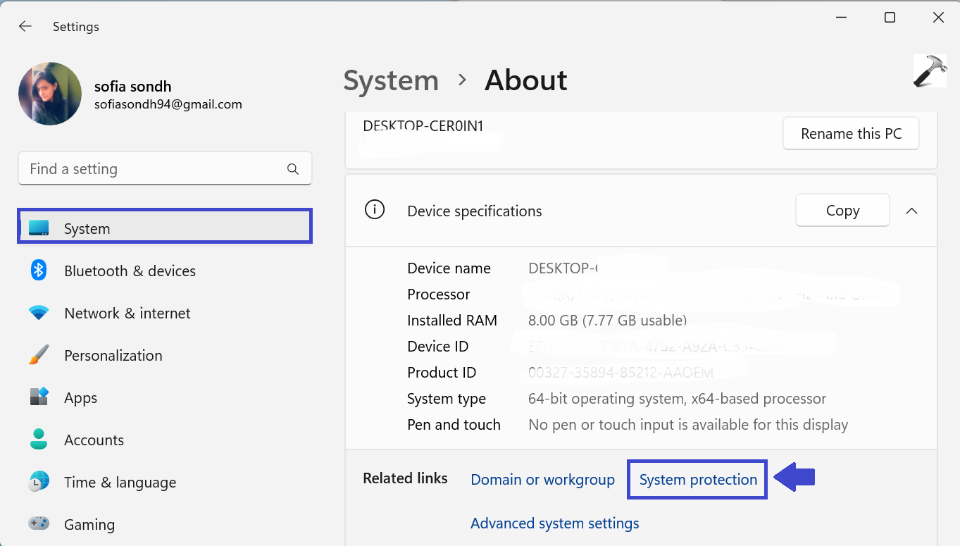 2. Maintenant, cliquez sur «Protection du système« .