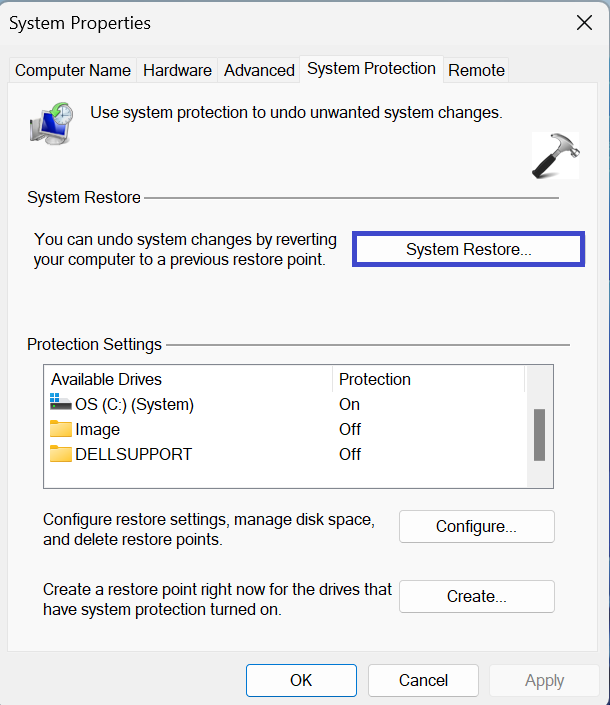 3. Après avoir cliqué sur «Protection du système", une boîte de dialogue apparaîtra.