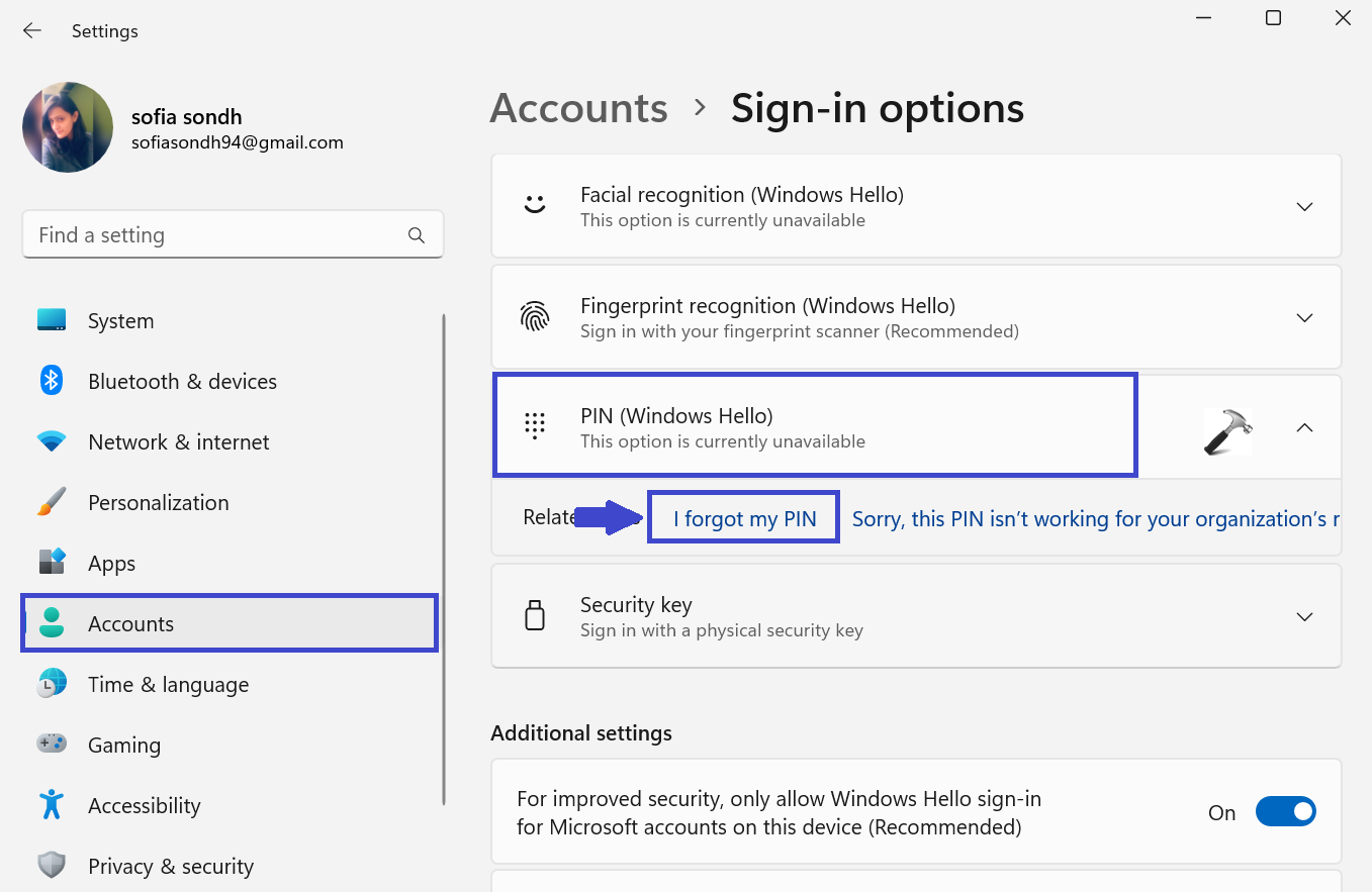 2. Accédez aux options de connexion. Dans la section PIN, cliquez sur « J'ai oublié mon code PIN ».