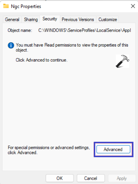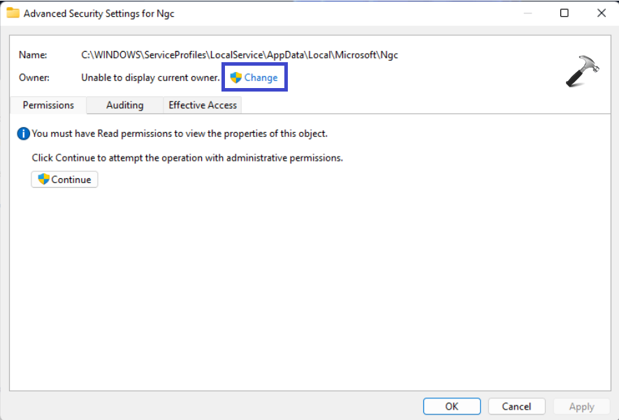6. Il revient à l'interface Paramètres de sécurité avancés pour Ngc. Mais cette interface n’est plus la même qu’avant. Maintenant, vous pouvez voir leRemplacer le propriétaire sur les sous-conteneurs et les objetsoption sous Propriétaire. Vous devez cocher cette option pour continuer.