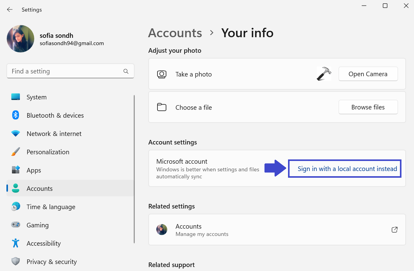 Pour résoudre le problème, vous devez convertir votre compte Microsoft en compte local. Vous pouvez le faire en suivant les étapes ci-dessous.