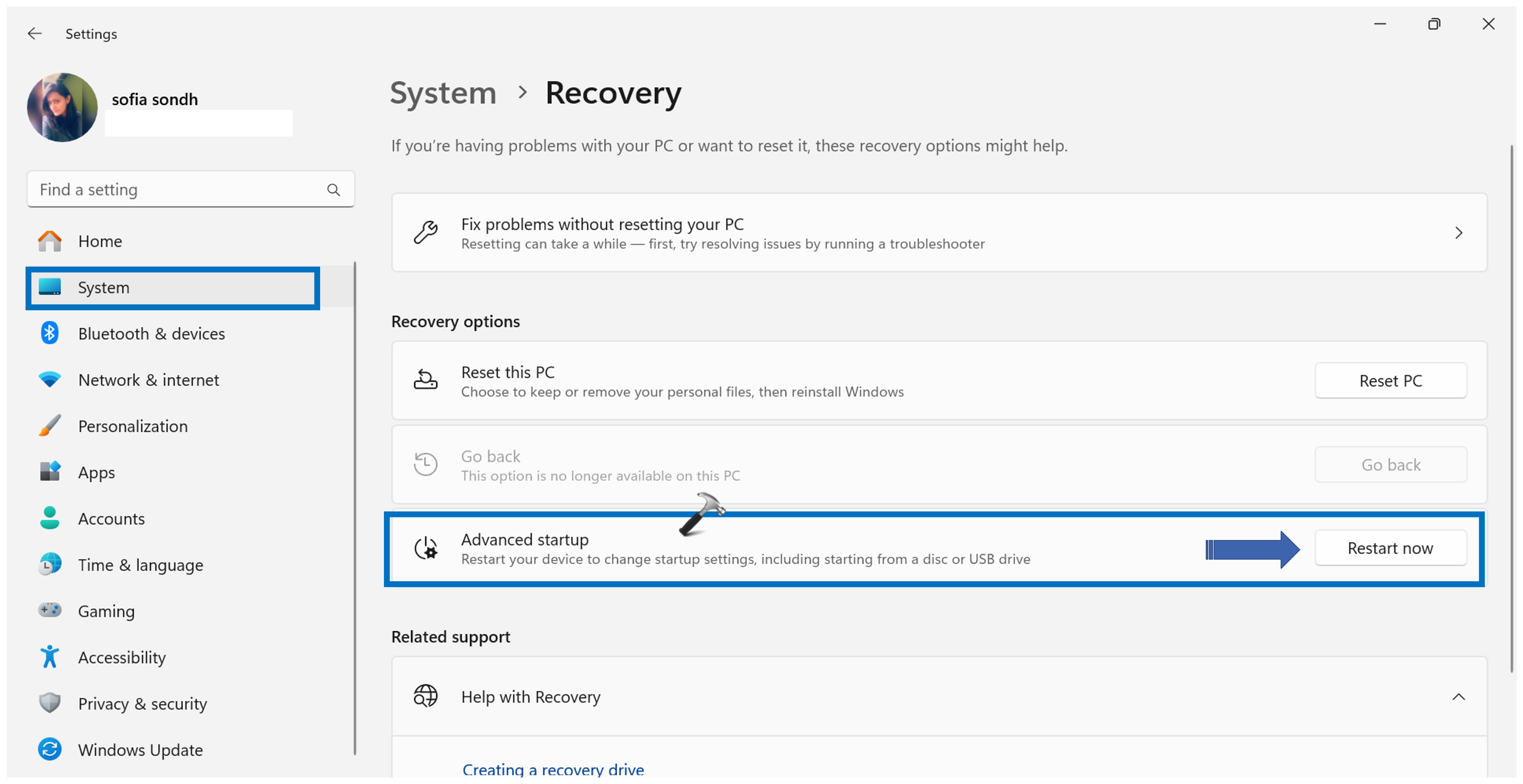 2. Sous «Options avancées", cliquez sur "Redémarrez maintenant“.