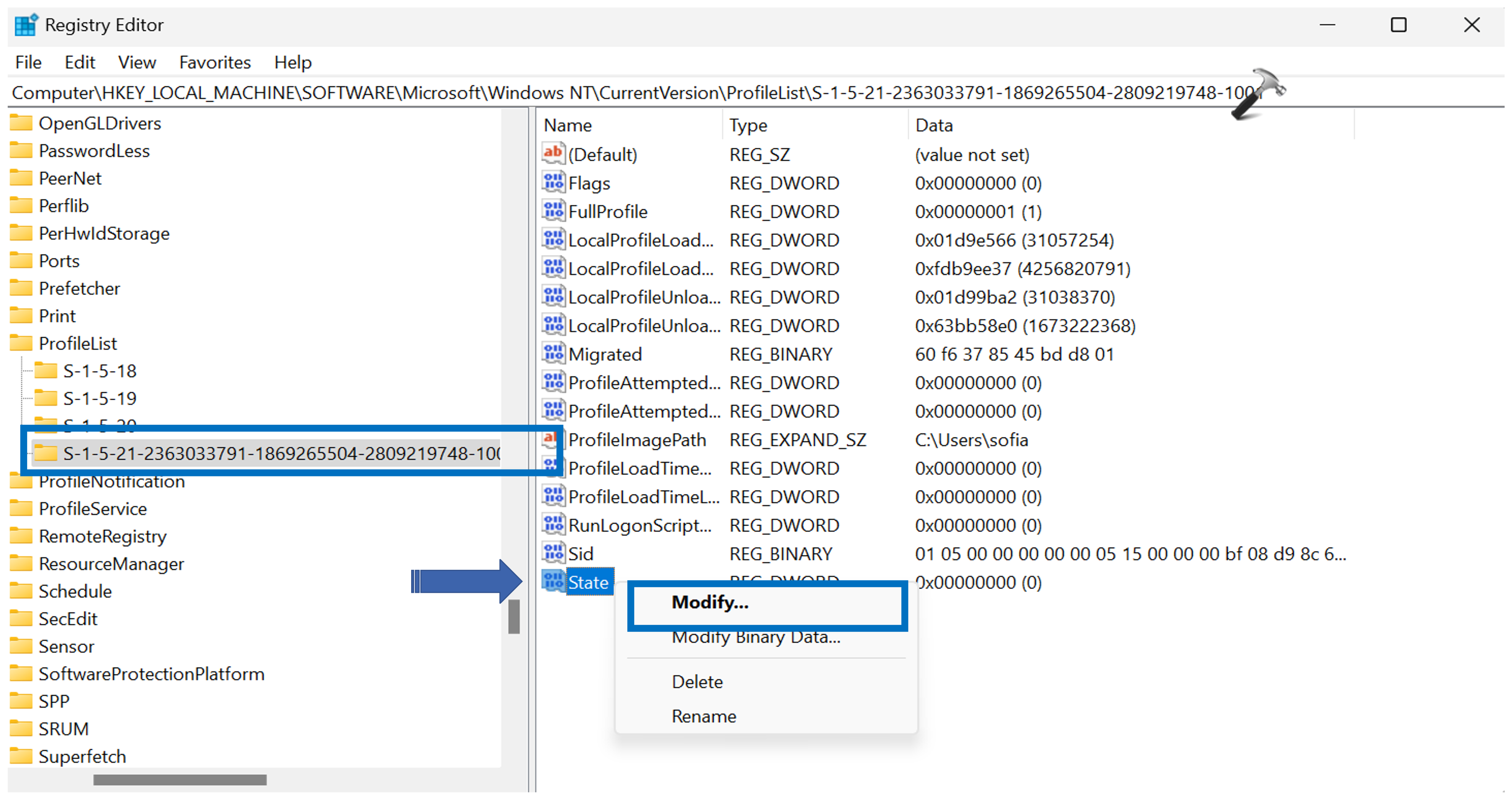 ComputerHKEY_LOCAL_MACHINESOFTWAREMicrosoftWindows NTCurrentVersionProfileList