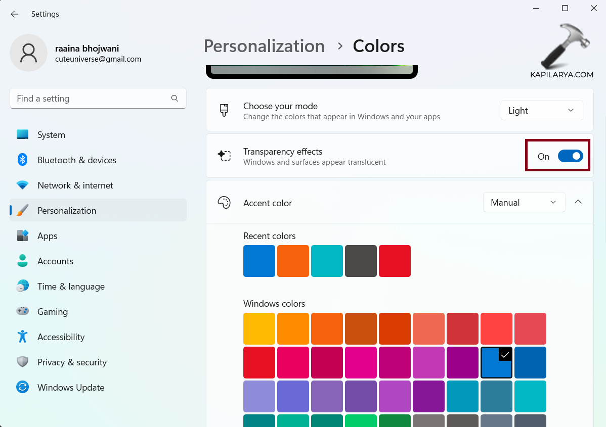 3. Basculez le bouton d'option « Effets de transparence » sur « Activé ».