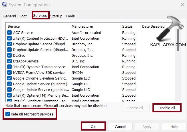 5. Cliquez ensuite sur le bouton « Désactiver tout » > bouton « OK ».
