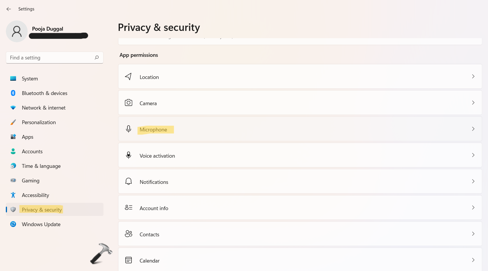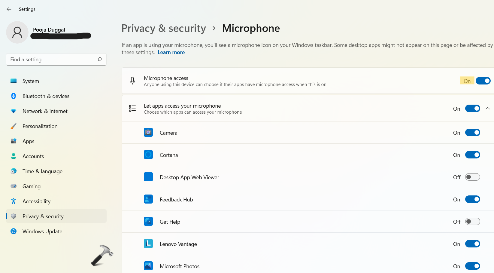 2.Maintenant, basculez l'interrupteurSurprésent à côté deAccès au microphone.