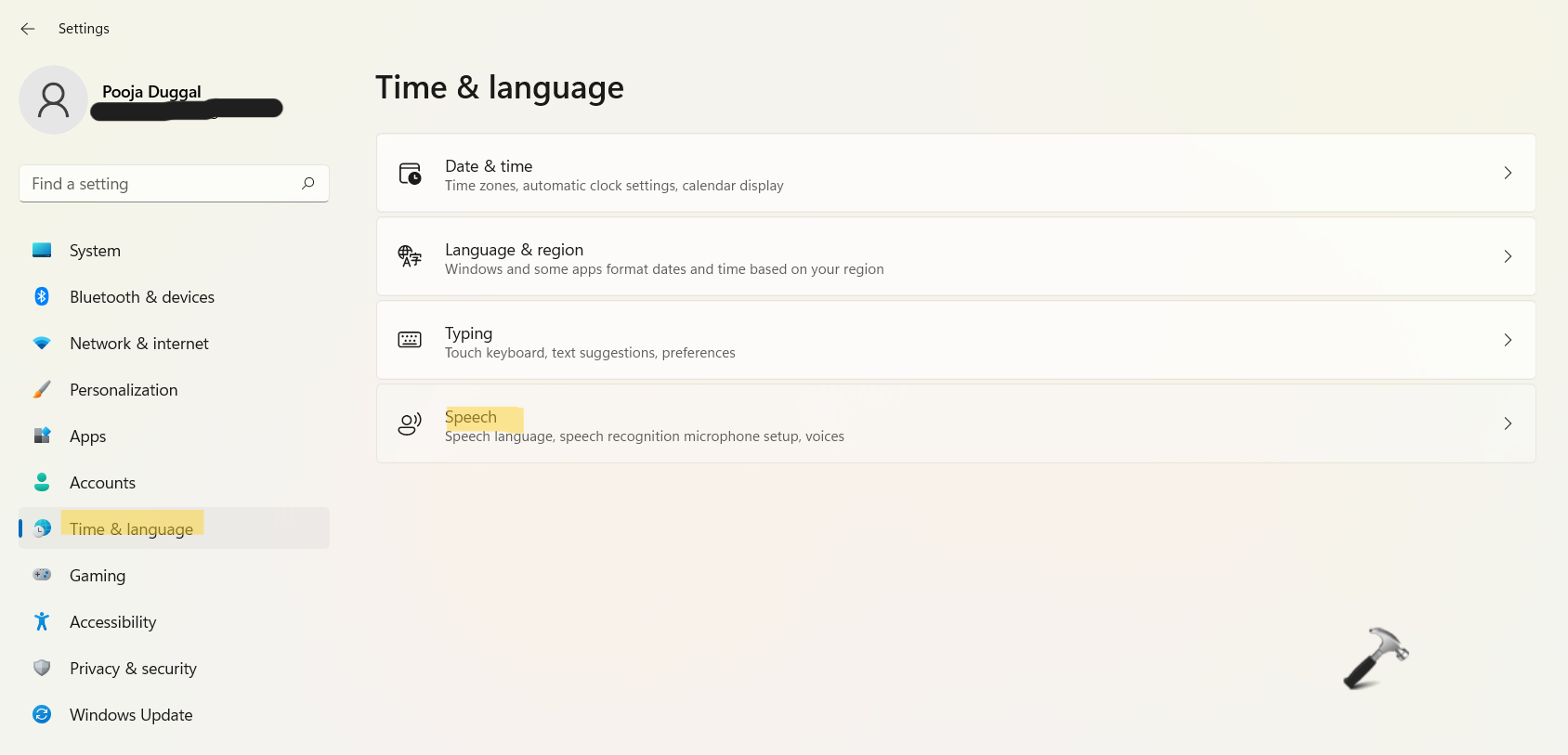 1.Tout d'abord, ouvrezParamètreset ensuite, allez auHeure et langueDans le volet de droite, cliquez surDiscours.