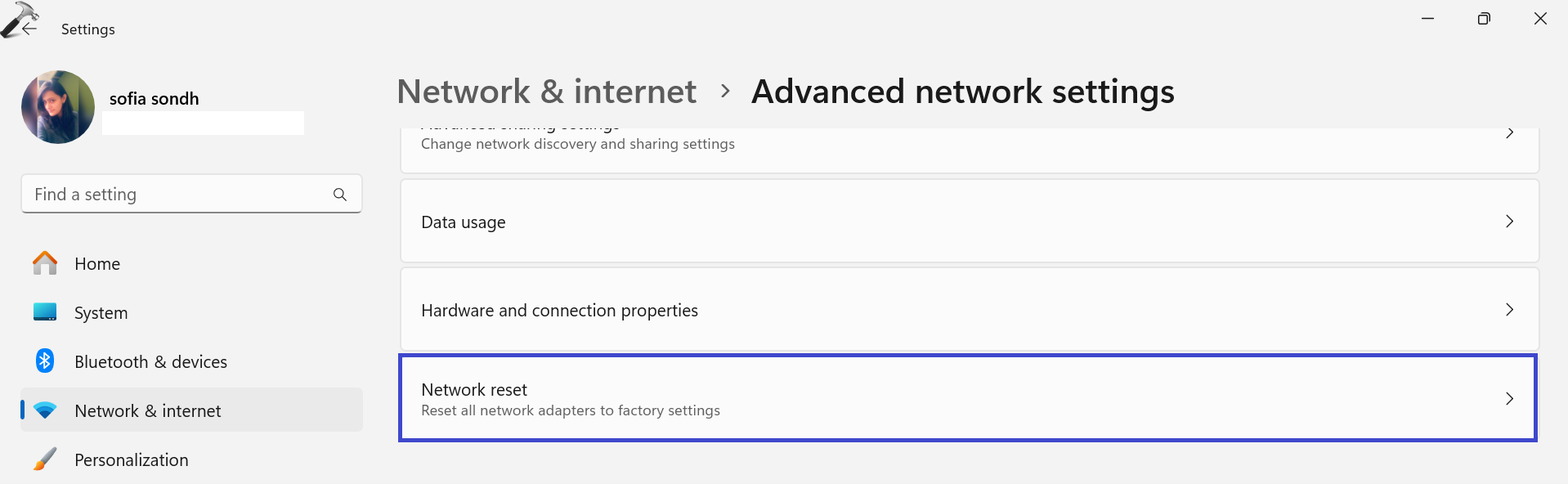 2. Cliquez sur le «Réinitialisation du réseau«Option sous le«Plus de paramètres" section.