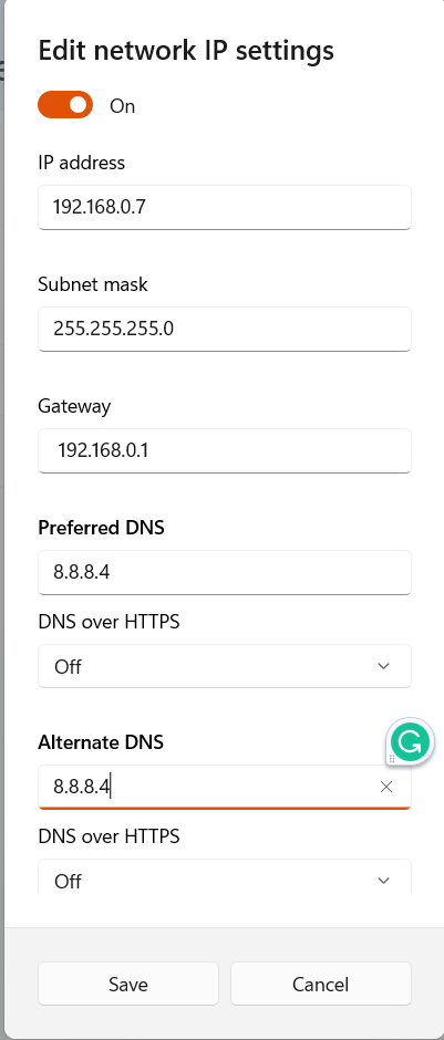 9. De même, copiez le masque de sous-réseau, la passerelle, le DNS préféré et le DNS alternatif à partir de l'invite de commande et collez-les dans les champs indiqués dans cette fenêtre. Cliquez sur Enregistrer.