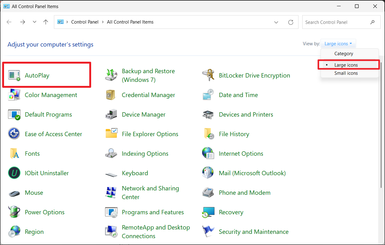 2. Réglez leVoirtapez "Grandes icônes »et sélectionnez «Lecture automatique“.
