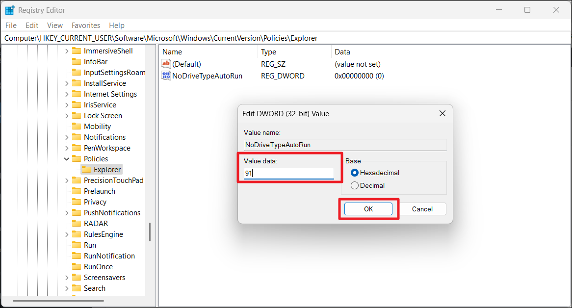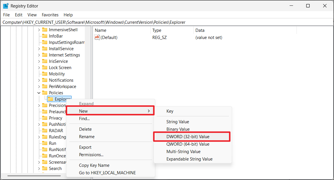 4. Double-cliquez sur le «NoDriveTypeAutoRun »DWORD. S'il n'existe pas, cliquez avec le bouton droit sur leExplorateurdossier et sélectionnezNouveau>Valeur DWORD (32 bits).Ensuite, nommez l'entréeNoDriveTypeAutoRun.