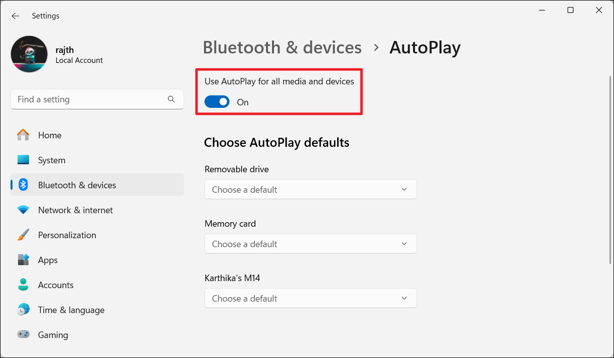 2. Accédez à «Bluetooth et appareils »> “Lecture automatique ».