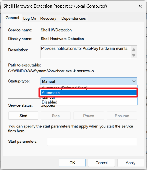Méthode 7 : Modifier le service de détection du matériel Shell