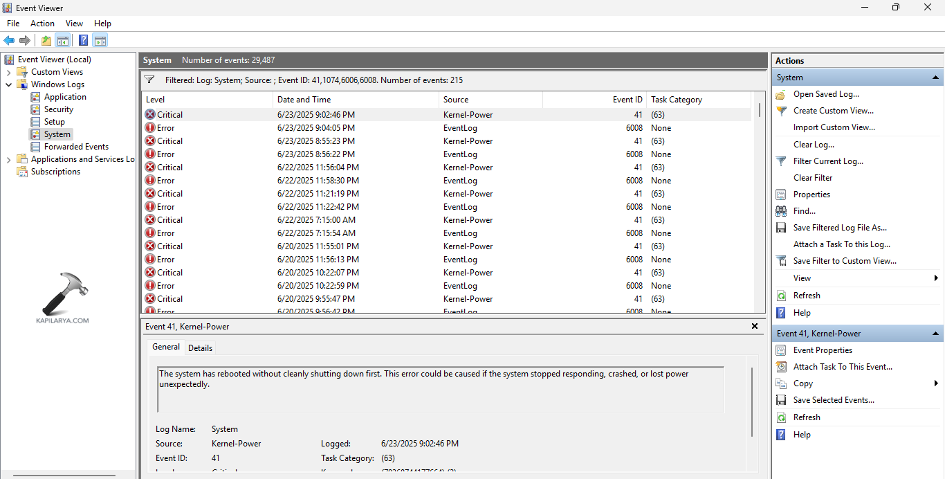Étape 5-Ici, l'Observateur d'événements affichera tous les événements liés à l'arrêt. Sélectionnez Journal critique ou Erreur. Il affichera les informations générales sur l'événement d'arrêt du PC.