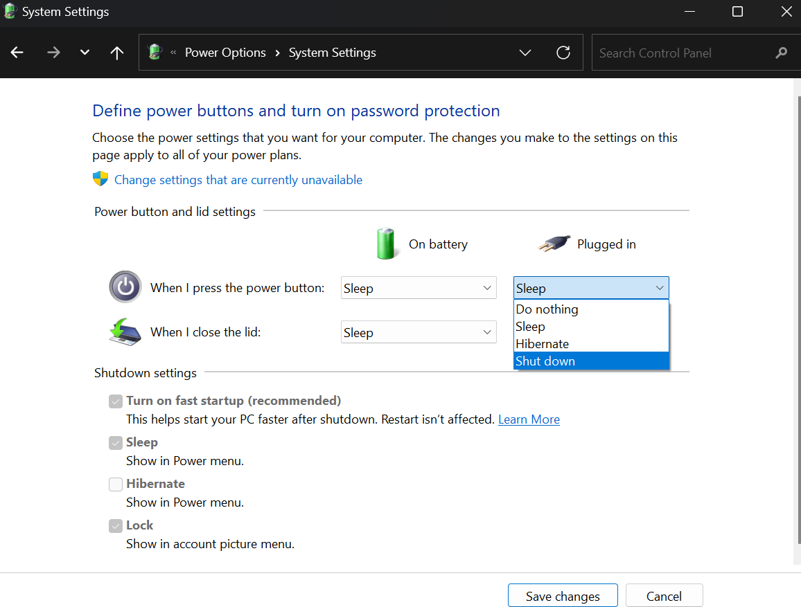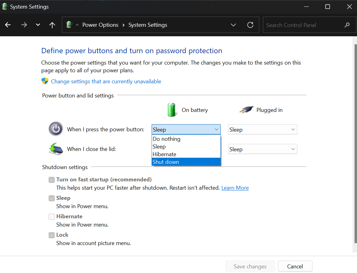 - Cliquez sur le menu déroulant deQuand j'appuie sur le bouton d'alimentationoption et choisissezFermer.