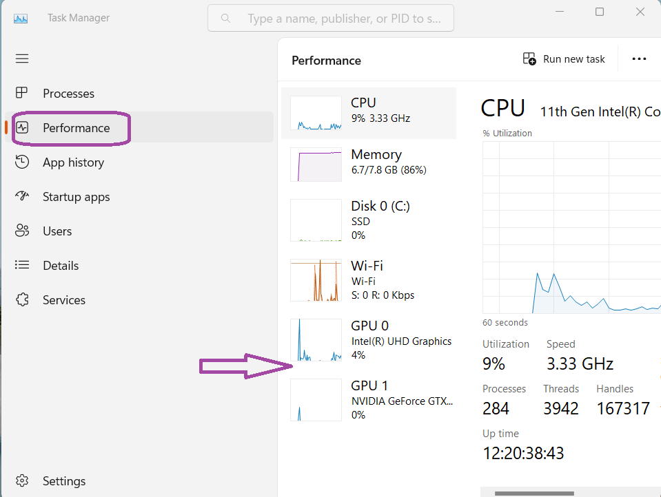 2. Cliquez surPerformanceet vérifiez le GPU. Une température GPU inférieure à 85 degrés est normale.