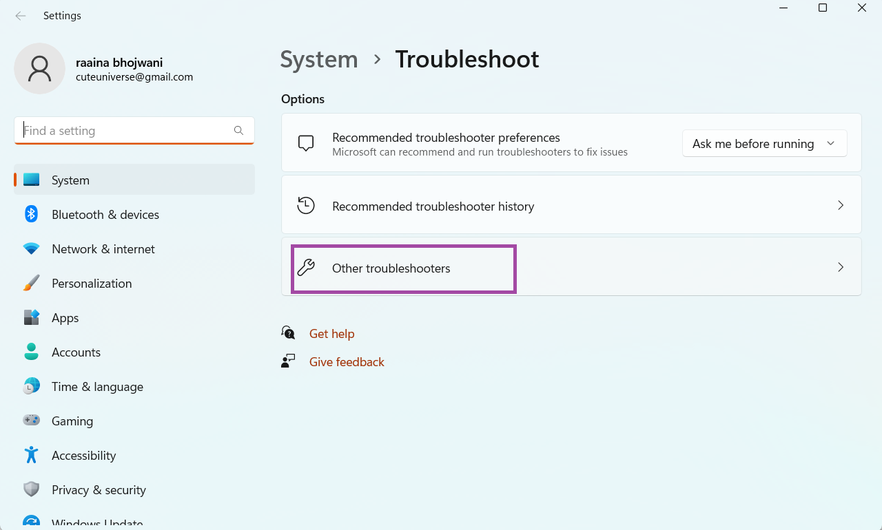 1. Dans le menu Démarrer, tapezdépanner les paramètreset frappéEntrer.