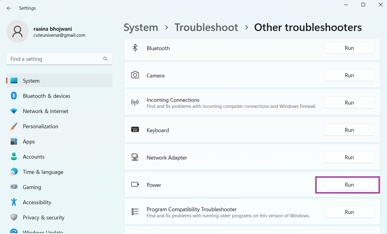 Correctif 4 : exécutez l'utilitaire de résolution des problèmes d'alimentation