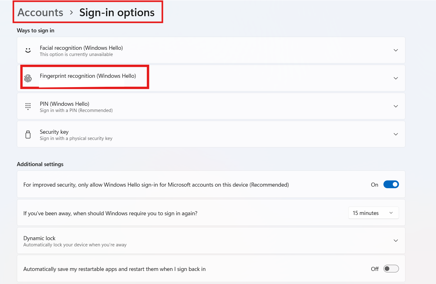 3. Sélectionnez « Reconnaissance d'empreintes digitales » (Windows Hello) et cliquez sur Supprimer.