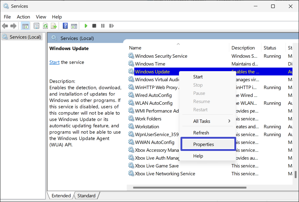 3. Cliquez avec le bouton droit surMise à jour de la fenêtreservice à nouveau et sélectionnez «Propriétés“.