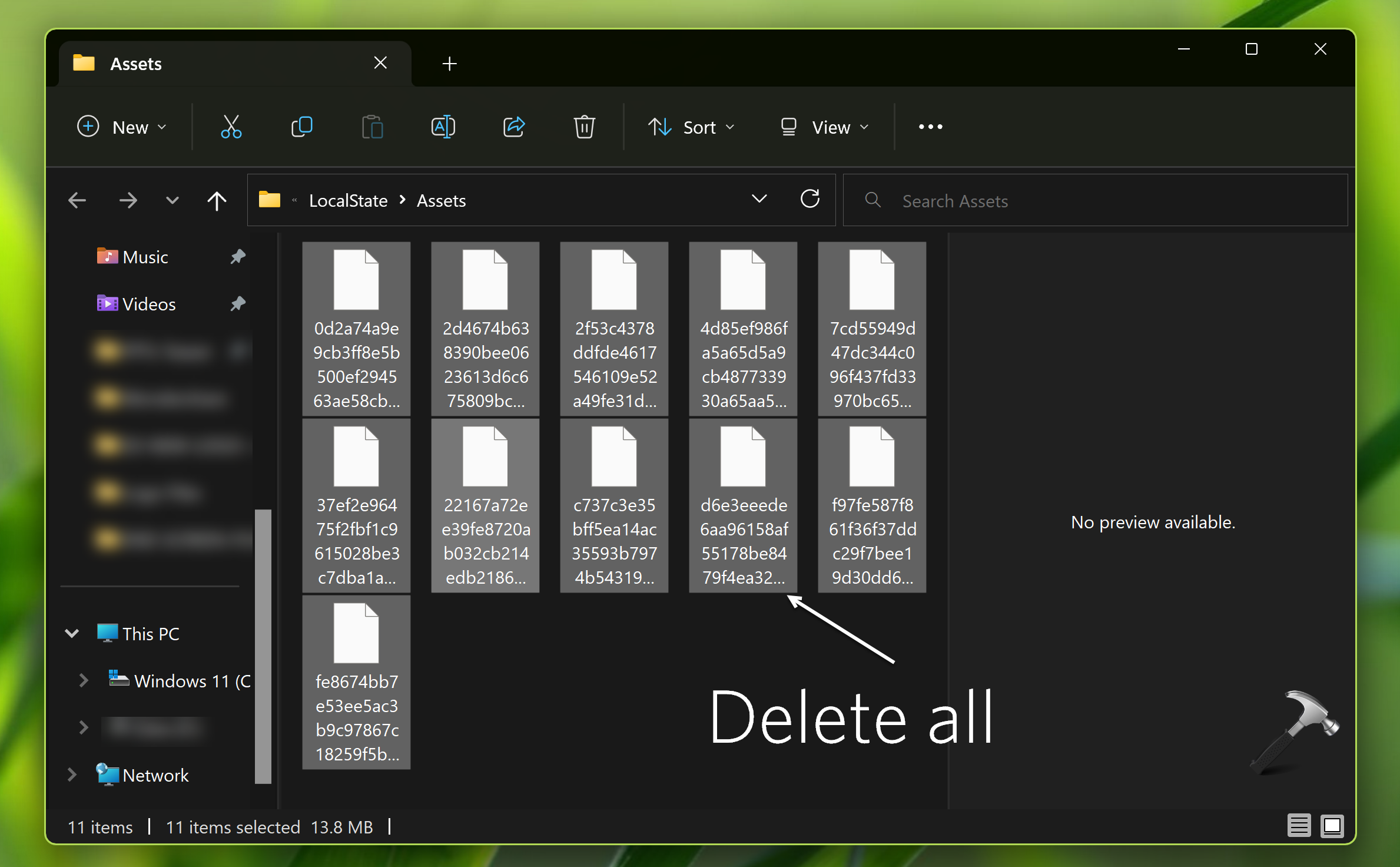 3. Lorsque le dossier Assets est ouvert, sélectionnez simplement tous les fichiers de ce dossier et appuyez sur la touche Suppr. Ces fichiers seront maintenant déplacés vers la Corbeille.