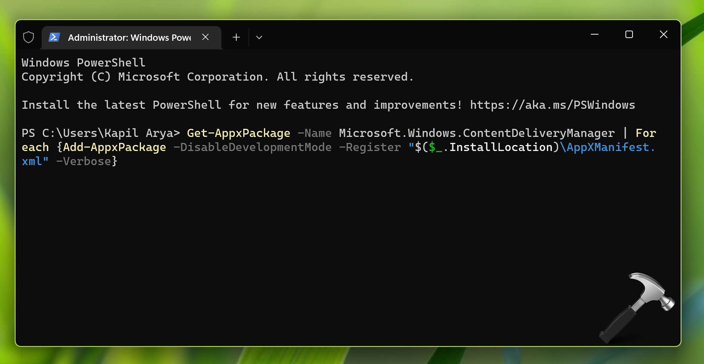 Get-AppxPackage -Name Microsoft.Windows.ContentDeliveryManager | Foreach {Add-AppxPackage -DisableDevelopmentMode -Register "$($_.InstallLocation)AppXManifest.xml" -Verbose}3. Une fois la commande exécutée avec succès, Windows Spotlight devrait être réenregistré sur votre système et devrait commencer à fonctionner comme prévu.
