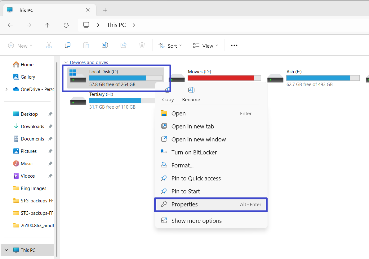2. Cliquez avec le bouton droit sur le lecteur système et sélectionnez «Propriétés“.
