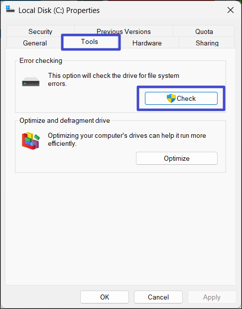 3. Dans la fenêtre Propriétés, accédez à «Outils", puis cliquez sur l'onglet "Vérifier" bouton.