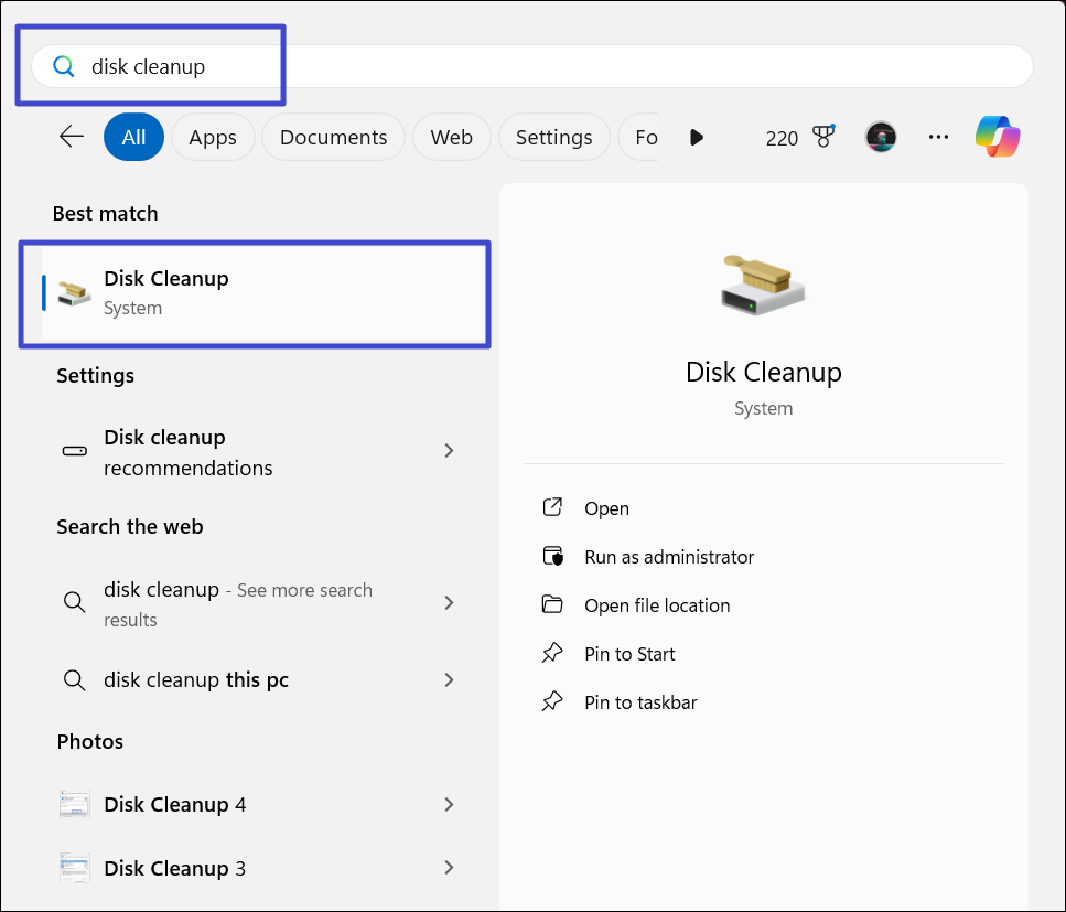 1. Ouvrez la recherche Windows, tapez «Nettoyage de disque », puis sélectionnez le meilleur résultat.