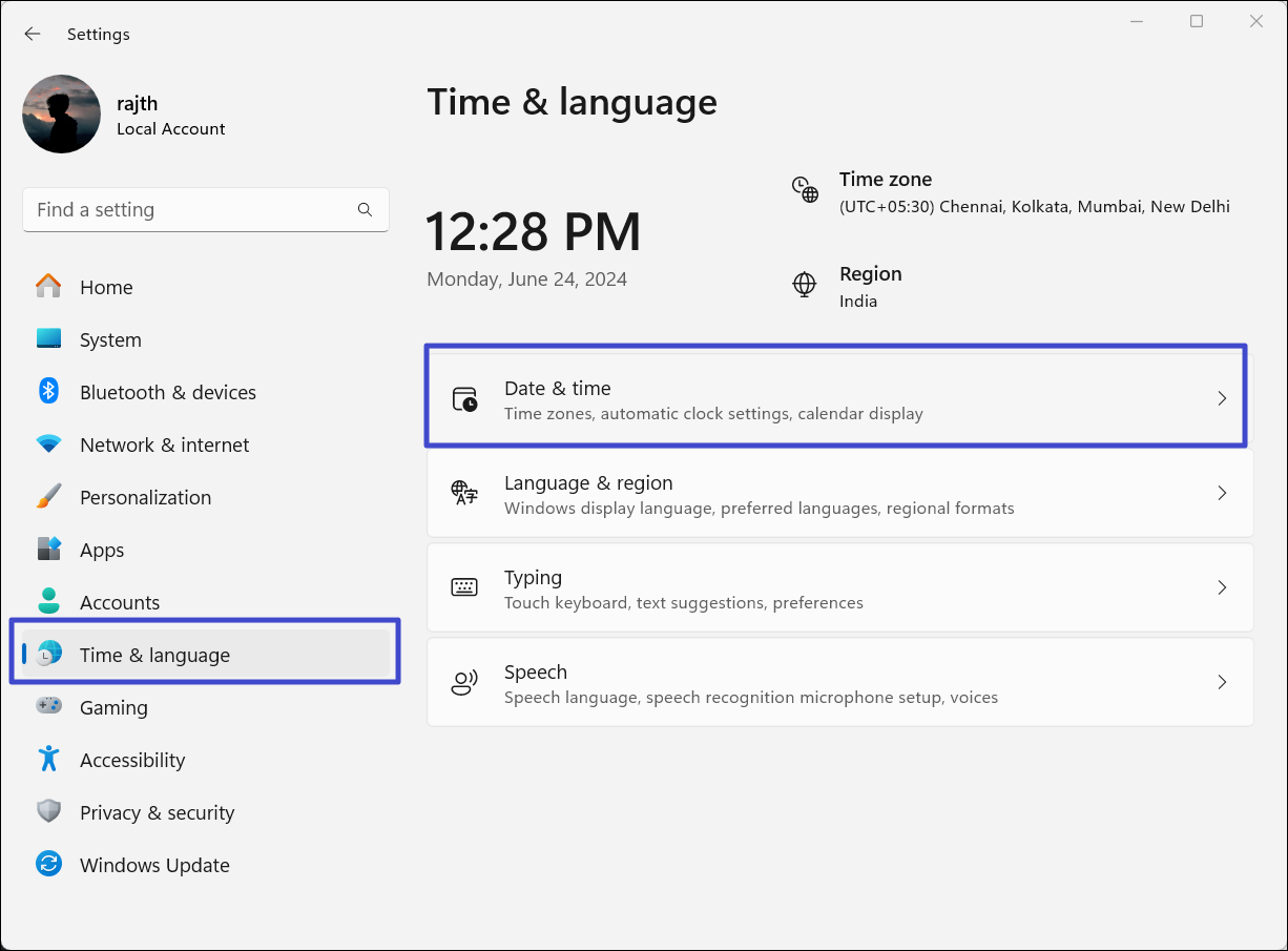 1. Ouvrez l'application des paramètres Windows et sélectionnez «Heure et langue“.