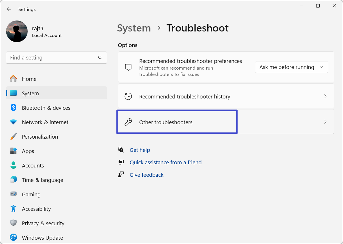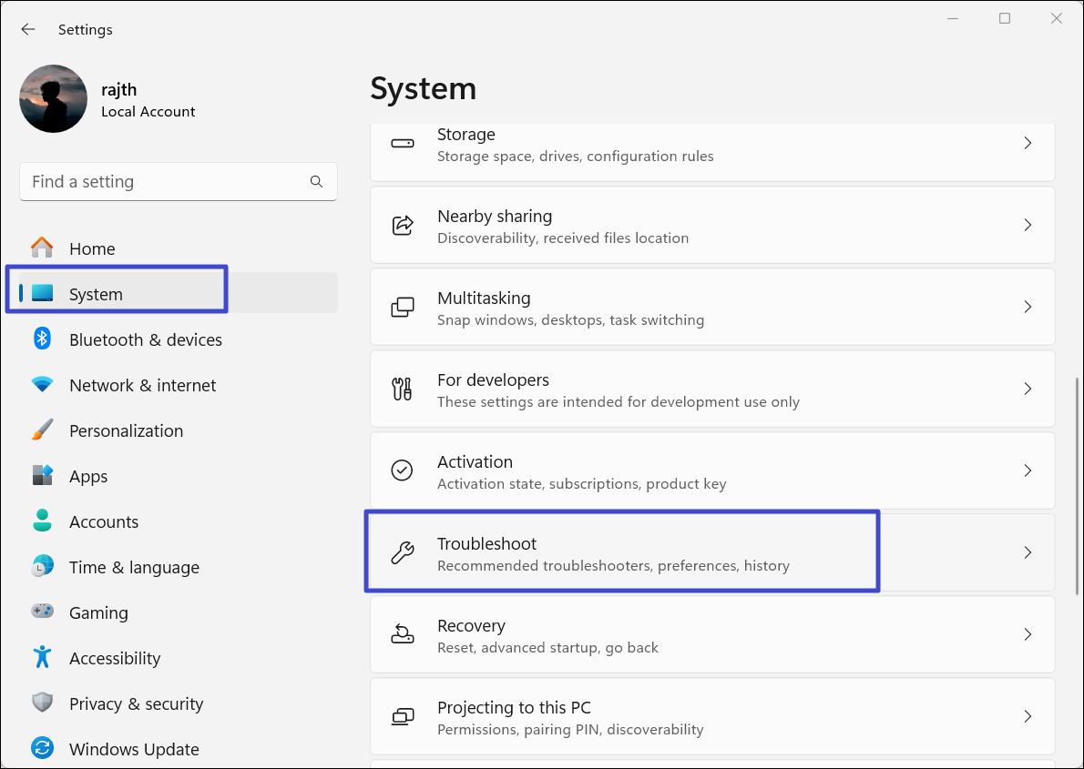 1. Ouvrez les paramètres Windows et accédez à «Système"> “Dépanner ».