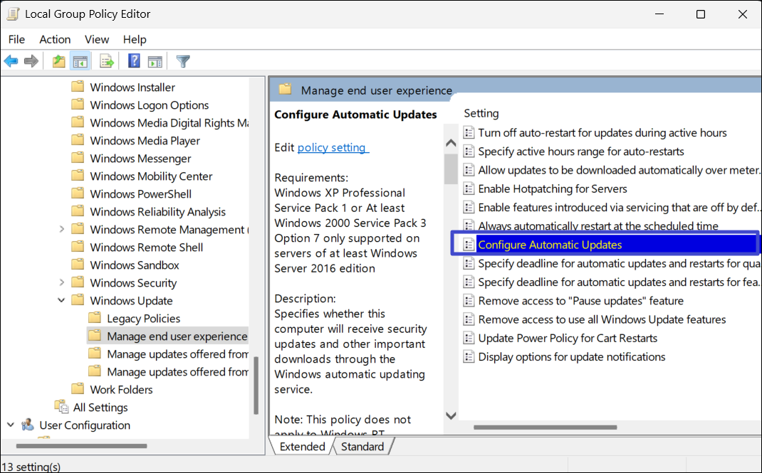 Configuration ordinateur > Modèles d'administration > Composants Windows > Windows Update > Gérer l'expérience de l'utilisateur final