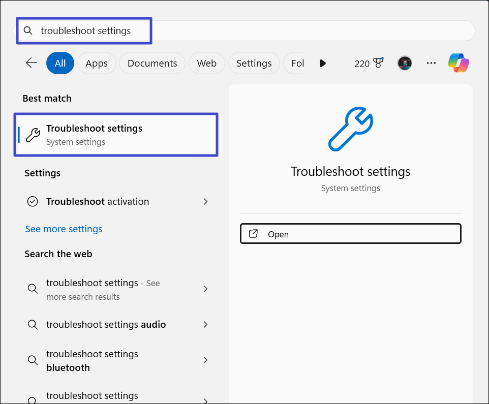 1. Ouvrez la recherche Windows, tapez «Dépanner les paramètres“, et sélectionnez le meilleur résultat.