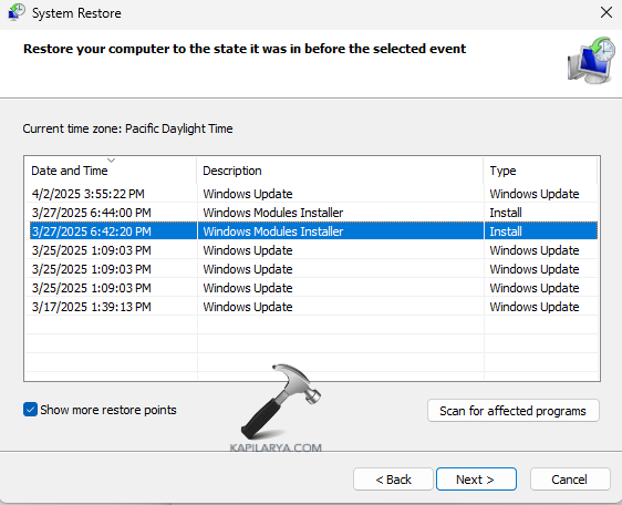 Étape 3-Maintenant, parmi les points de restauration, choisissez celui souhaité pour restaurer le PC et appuyez sur Suivant.