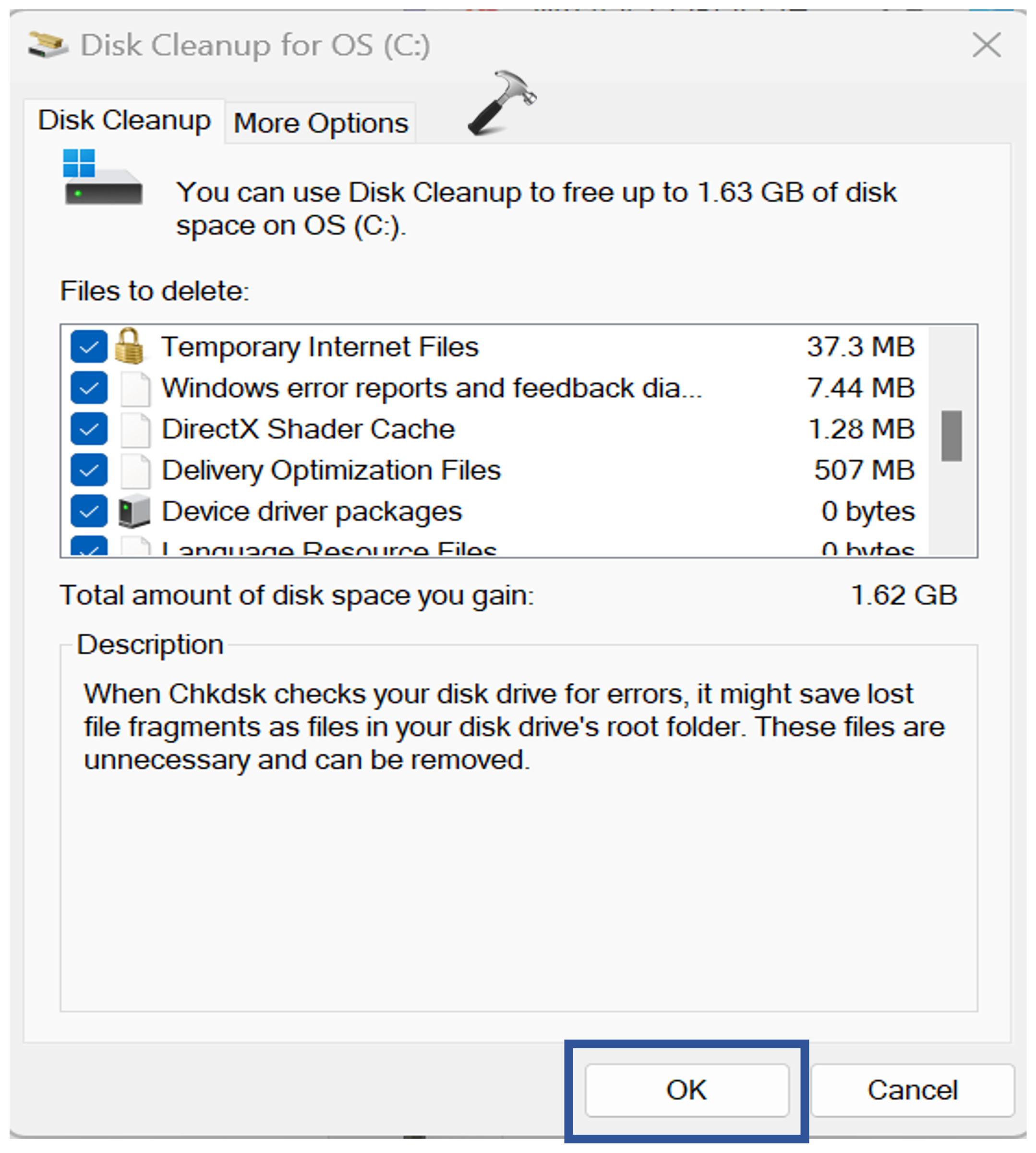 2. Le «Nettoyage du disque" Une fenêtre contextuelle apparaîtra. Cliquez sur OK.