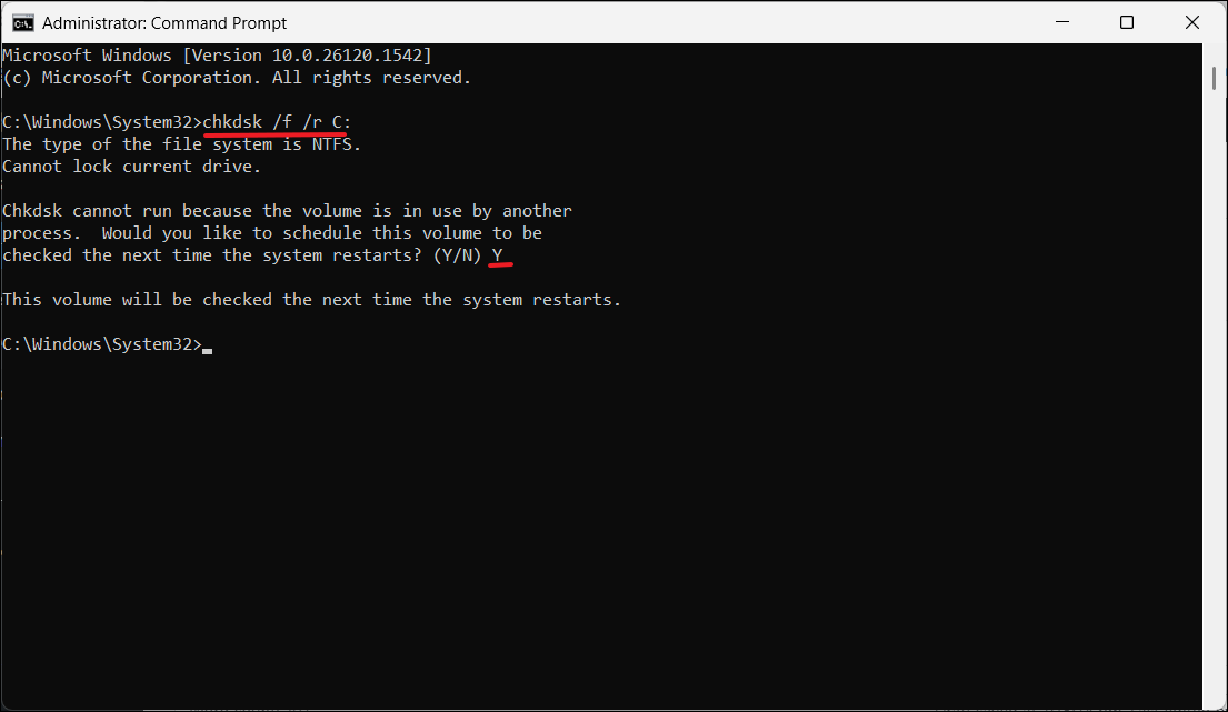 Si vous êtes invité à planifier la vérification au prochain redémarrage, tapezETet appuyez surEntrer.