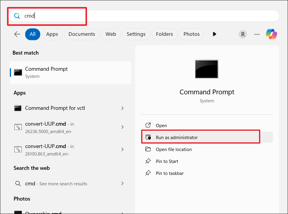 1. Ouvrez l'invite de commande en tant qu'administrateur.