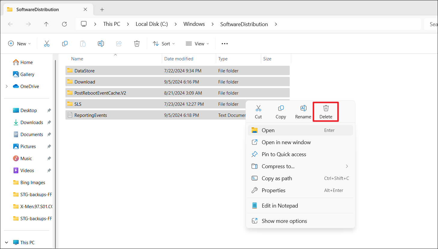 6. Supprimez tout le contenu du dossier Software Distribution.
