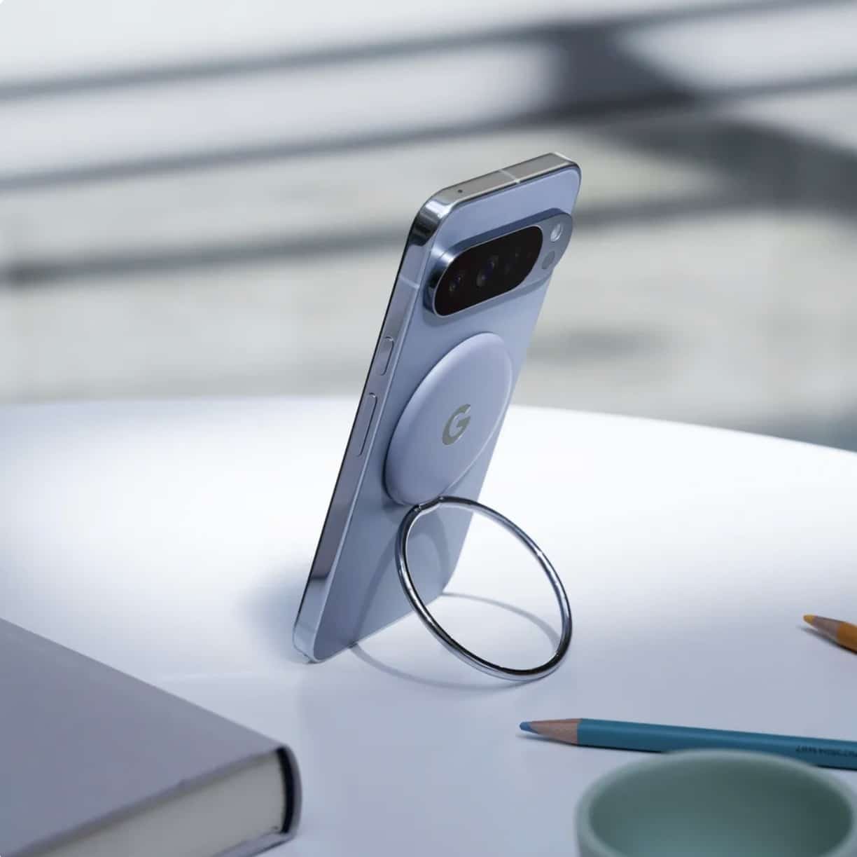 L'anneau Pixelsnap se fixe magnétiquement à l'arrière des appareils Pixel compatibles. Il sert également de poignée pour une utilisation à une main et peut également servir de béquille pour la lecture vidéo. Le design est mince, ce qui facilite le retrait ou l'échange avec d'autres accessoires.
